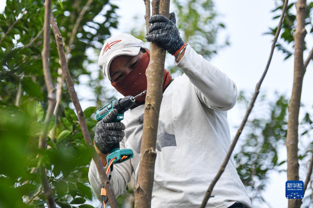 2月22日,工人在海南省儋州市那大沉香基地打孔造香。