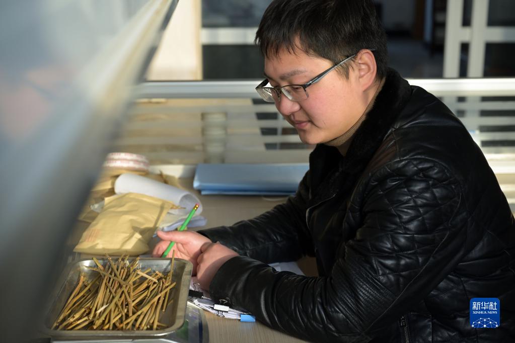 2月21日,在太和縣淙祥現代農業種植專業合作社,徐旭東在實驗室里對農作物樣品進行稱重和記錄。