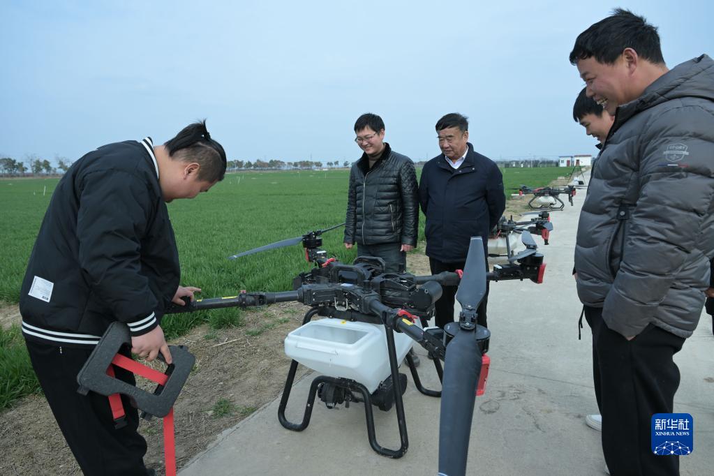 2月21日,在太和縣淙祥現代農業種植專業合作社,徐旭東(左二)和爺爺徐淙祥(左三)查看用于噴灑農藥的無人機。