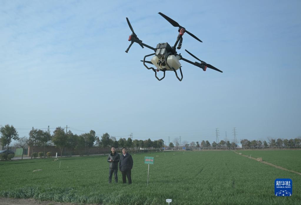 2月21日,在太和縣淙祥現代農業種植專業合作社,徐旭東(左)和爺爺徐淙祥用無人機對田里噴灑農藥。
