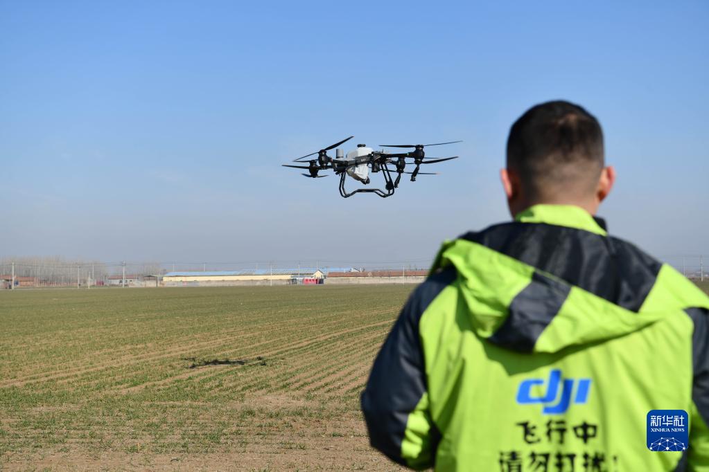 2月23日,在鄒平市長山鎮八方農場活動現場,農機手進行無人機智慧噴灑作業演示。