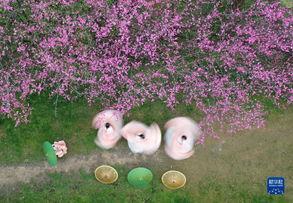春回大地,在湖南省張家界市武陵源區黃龍洞景區,梅花爭艷綻放,春意盎然,吸引人們來到戶外踏春賞花,樂享春光。