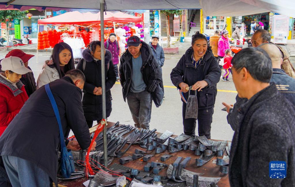 2月23日,村民在貴州省務川仡佬族苗族自治縣茅天鎮集市選購農具。