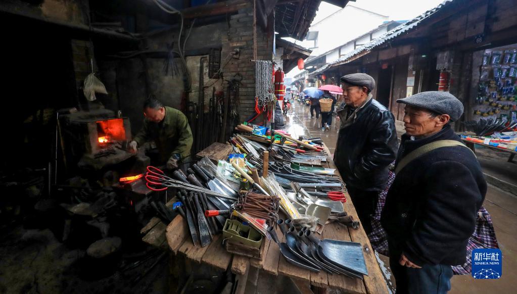 2月23日,在四川省瀘州市江陽區分水嶺鎮,村民在集市的鐵匠鋪加工農機配件。