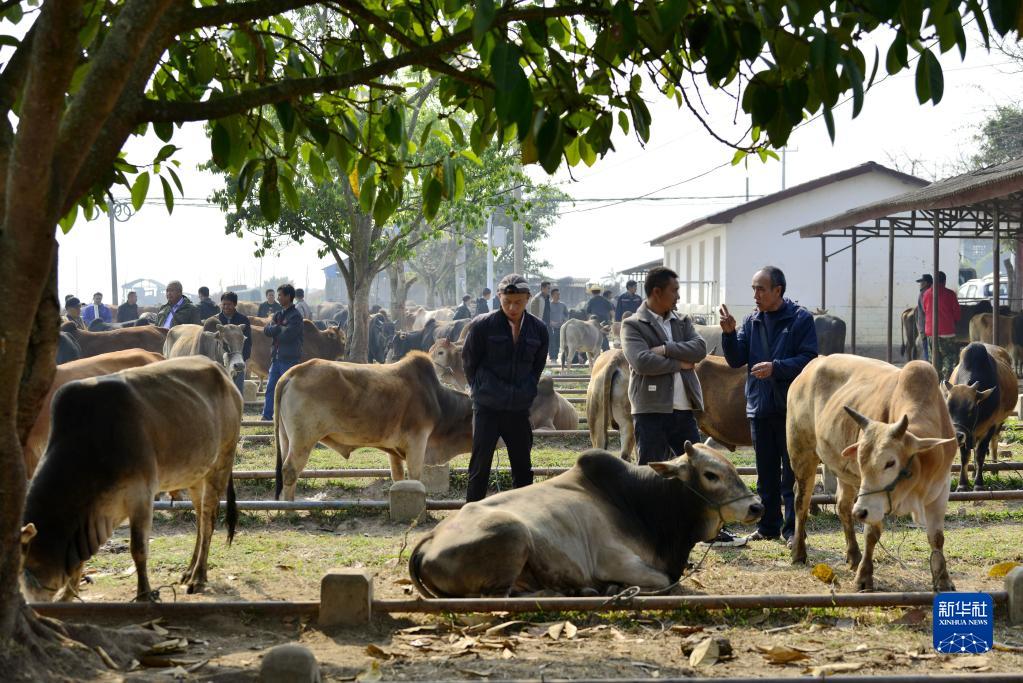 2月22日,人們在云南省西雙版納傣族自治州勐??h勐遮鎮曼燕大牲畜交易市場交易。