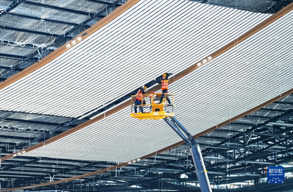 2月23日,中鐵建設集團有限公司施工人員在新建福廈鐵路廈門北站候車大廳開展吊頂安裝作業。