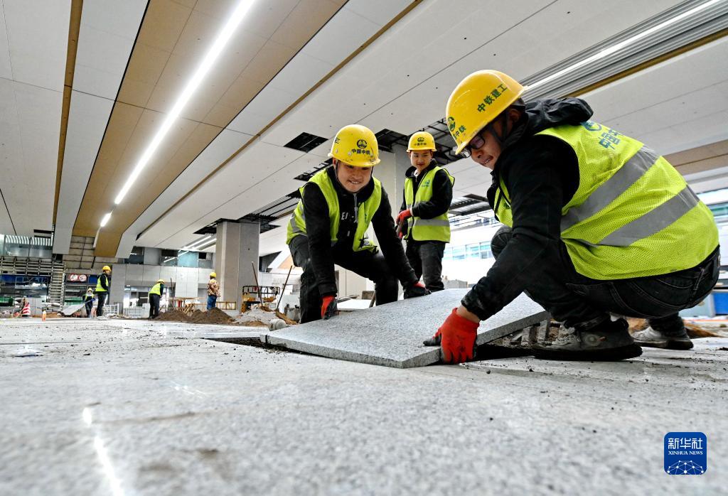 2月21日,中鐵建工集團有限公司施工人員在新建福廈鐵路福州南站鋪設地板。