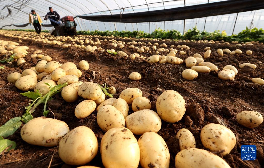 2月23日,在山東省棗莊市嶧城區古邵鎮梅花臺村大棚,農民使用機械設備收獲早春“訂單”土豆。