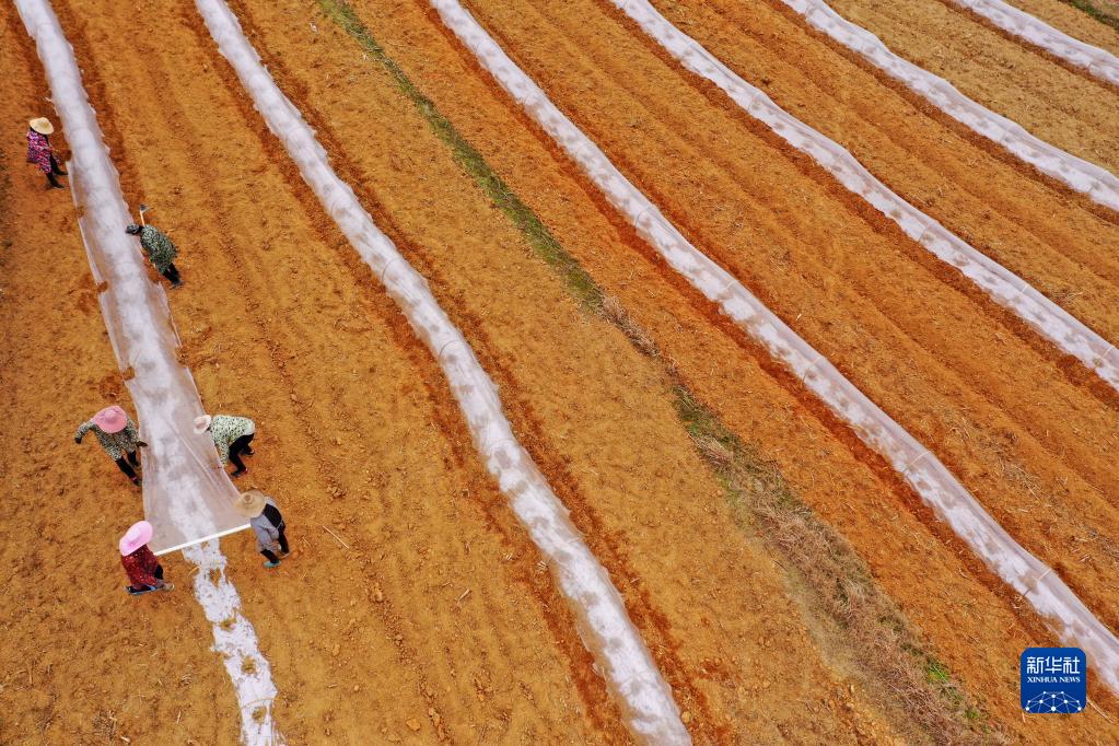 2月23日,在江西省吉安市泰和縣沿溪鎮倉嶺村,農民在田間給莊稼蓋膜(無人機照片)。