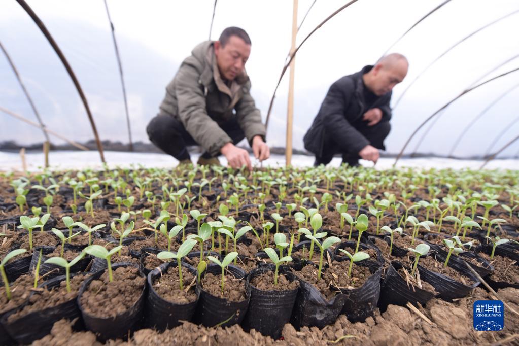 2月24日,農民在貴州省黔東南苗族侗族自治州岑鞏縣天星鄉東沖村西瓜育苗大棚管護西瓜苗。
