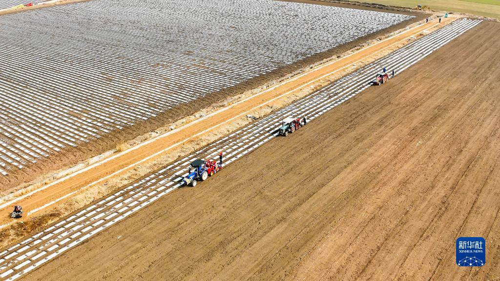 2月24日,山東省青島市即墨區藍村街道辛城村農民利用馬鈴薯播種機播種早茬馬鈴薯(無人機照片)。