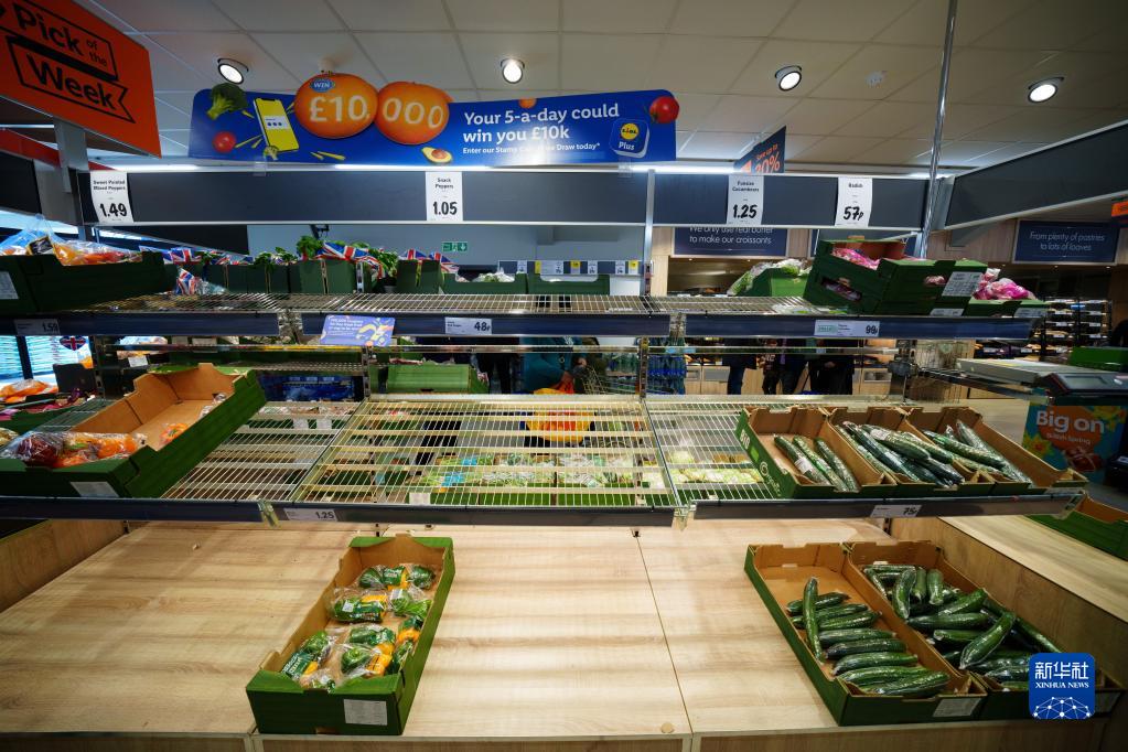 2月23日,在英國曼徹斯特,一家超市的蔬菜貨架出現缺貨。
