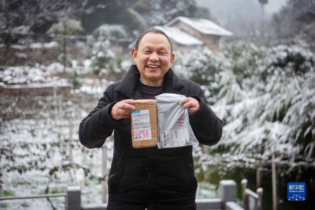2月22日,村民吳昌云展示在鑼圈巖村郵站取到的快遞。