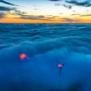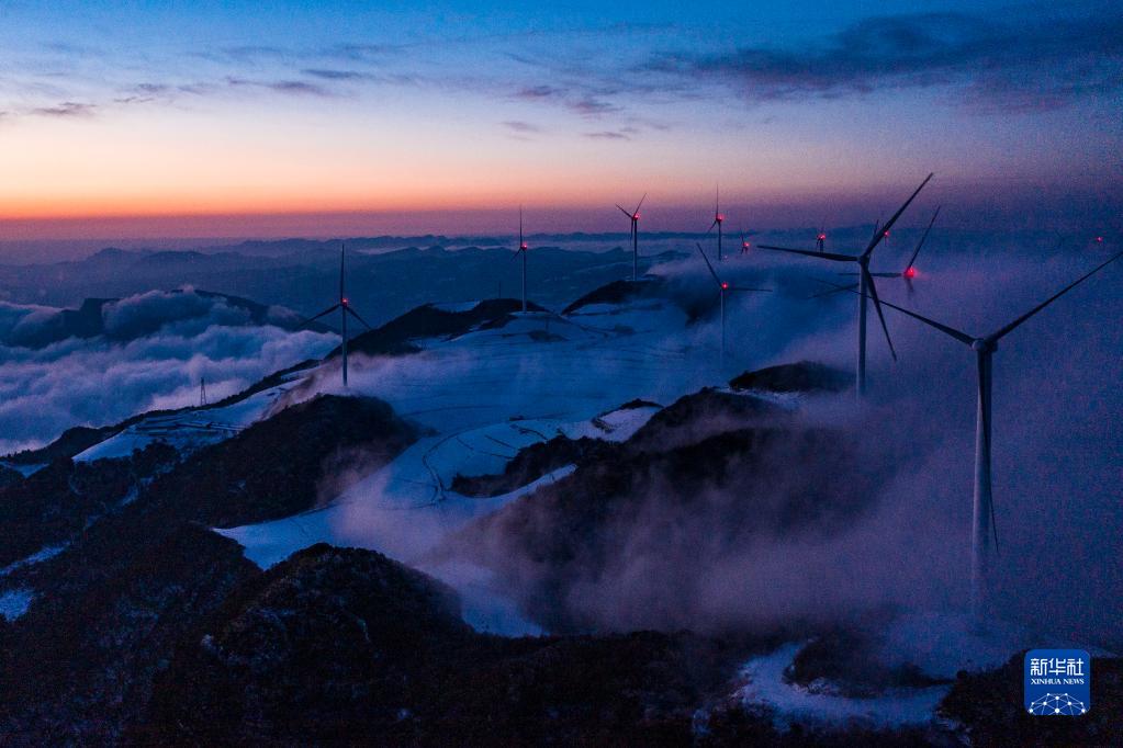 一場春雪過后,湖北省宜昌市秭歸縣云臺荒風力發電場銀裝素裹,風電機組在云海中旋轉,美景如畫。