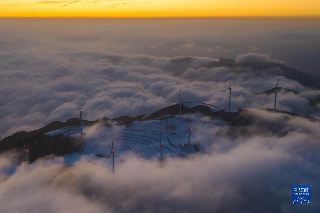 一場春雪過后,湖北省宜昌市秭歸縣云臺荒風力發電場銀裝素裹,風電機組在云海中旋轉,美景如畫。