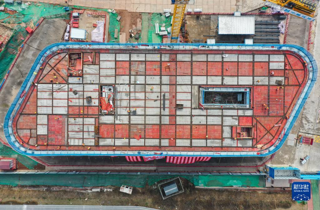 2月24日,在位于成都東部新區的四川大學華西東部醫院項目建設現場,工人在進行封頂施工作業(無人機照片)。