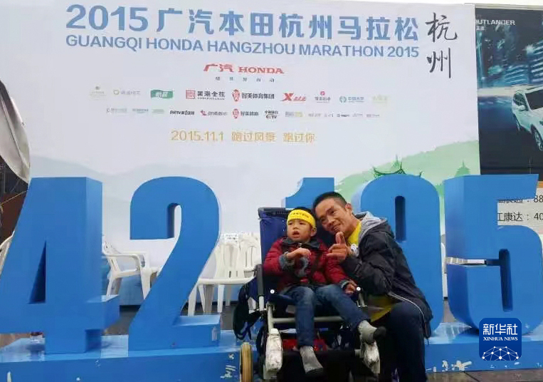 羅書堅(右)推著兒子小柏參加完杭州馬拉松7公里項目后留影(2015年11月1日攝)。