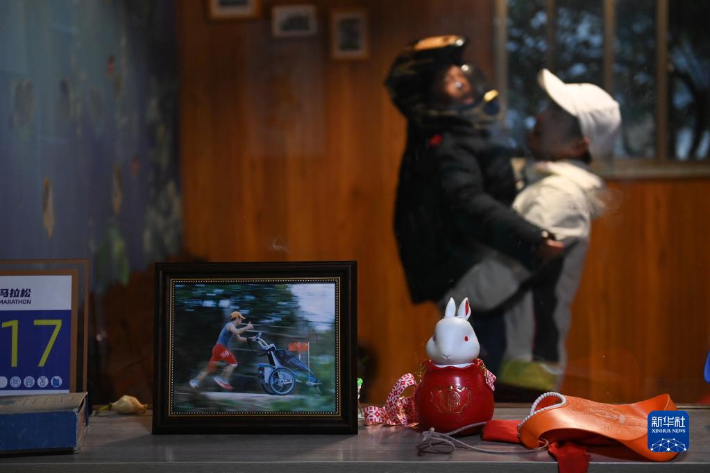2月24日,羅書堅(右)將兒子小柏抱至房間。目前,因并發癲癇,小柏不適合參加康復治療,日常在家戴著頭盔,由爺爺奶奶看護。