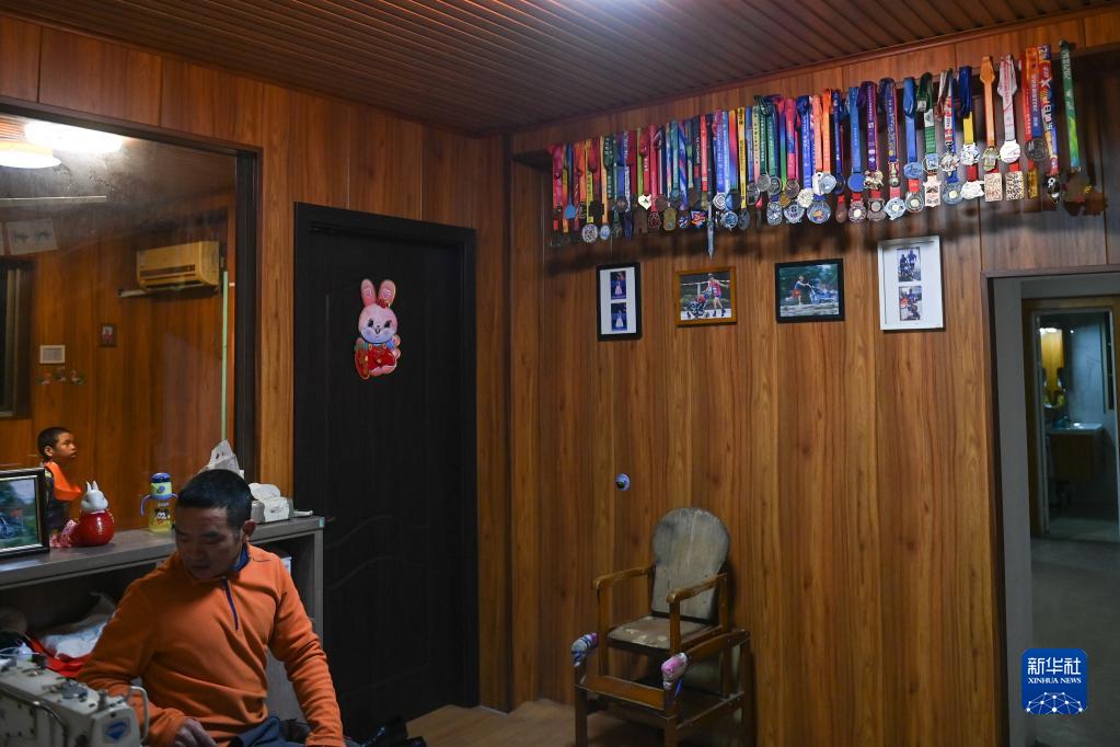 在小柏房間門口的墻上,掛著父子倆參賽的紀念獎牌及照片(2月23日攝)。