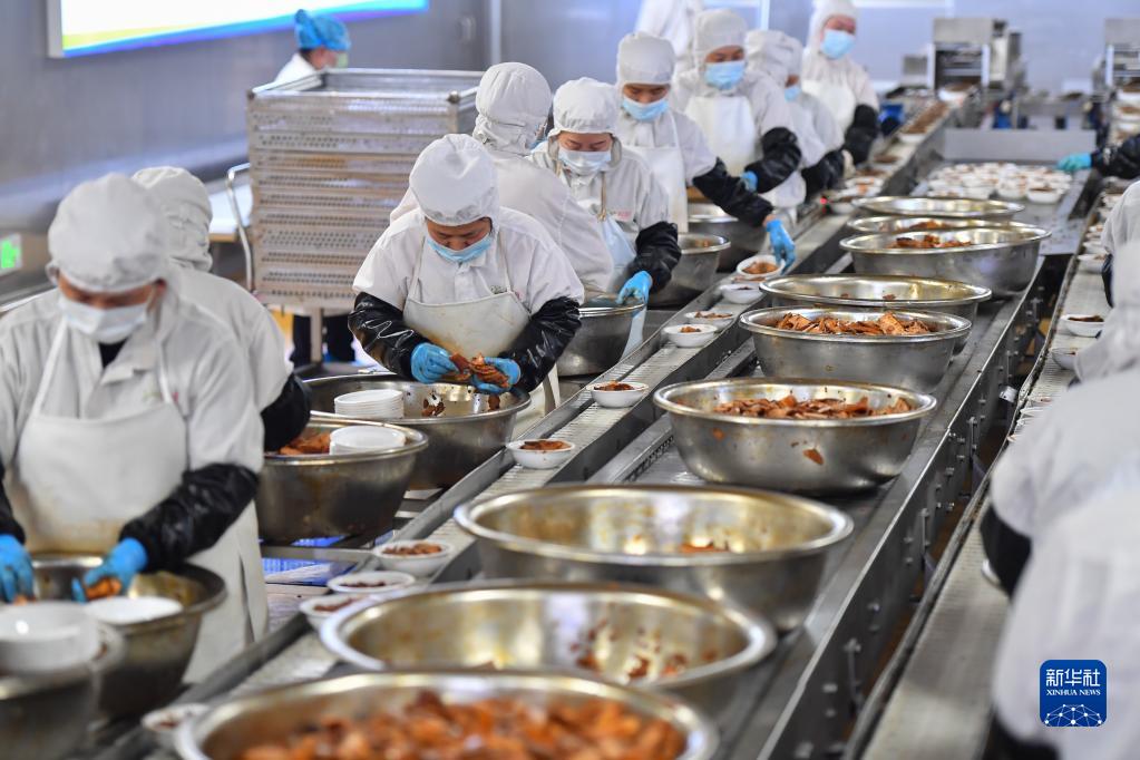 2月24日,瀏陽市省級農業科技園區一家預制菜企業工作人員在預制菜生產流水線上作業。