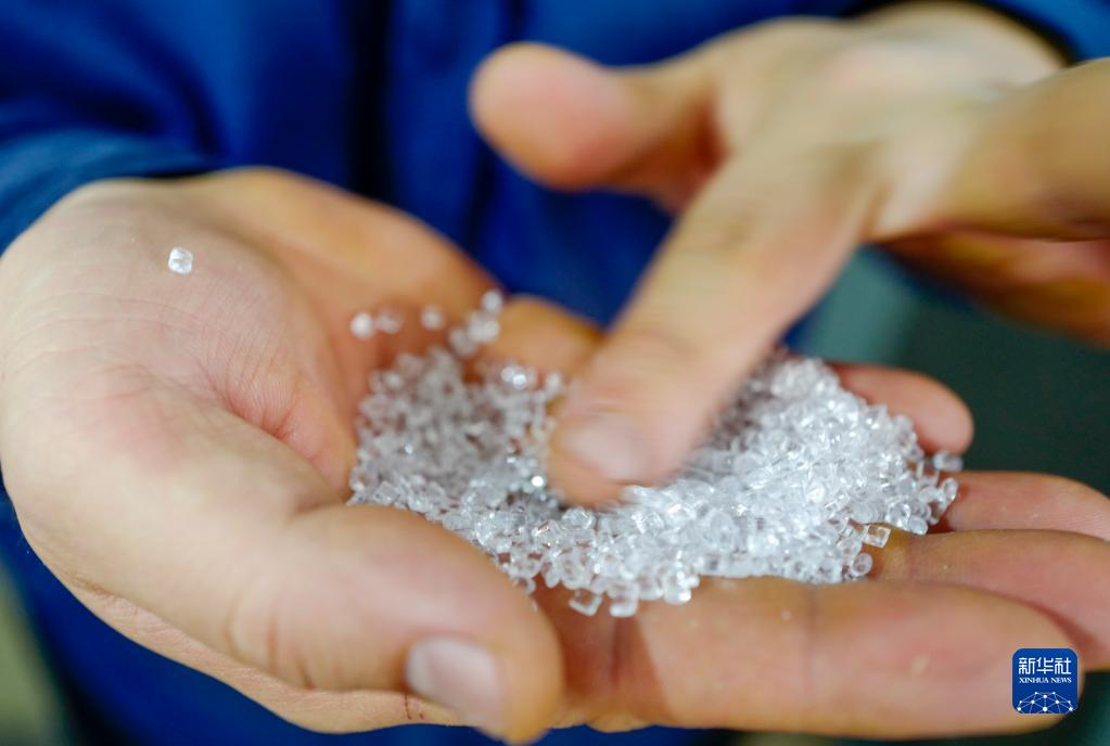 2月21日,在重慶萬凱新材料科技有限公司生產車間,技術工人對生產出的食品級PET高分子新材料進行檢查。