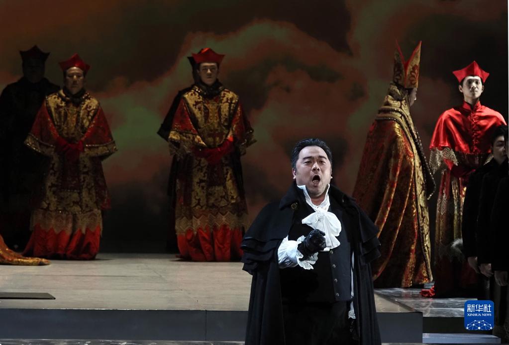 當晚,由國家大劇院、上海歌劇院與陜西大劇院聯合制作的新版普契尼歌劇《托斯卡》在上海大劇院上演。此次演出特別邀請上海歌劇院院長、著名指揮家、鋼琴家許忠執棒,著名女高音歌唱家和慧領銜主演。新版歌劇《托斯卡》還將在北京、西安和福建巡回上演。新華社記者 任瓏 攝