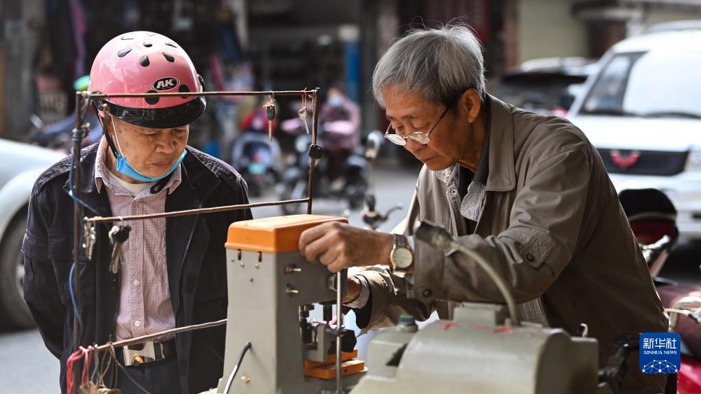 在欽州老街,一位老師傅在給市民配鑰匙(2月23日攝)。
