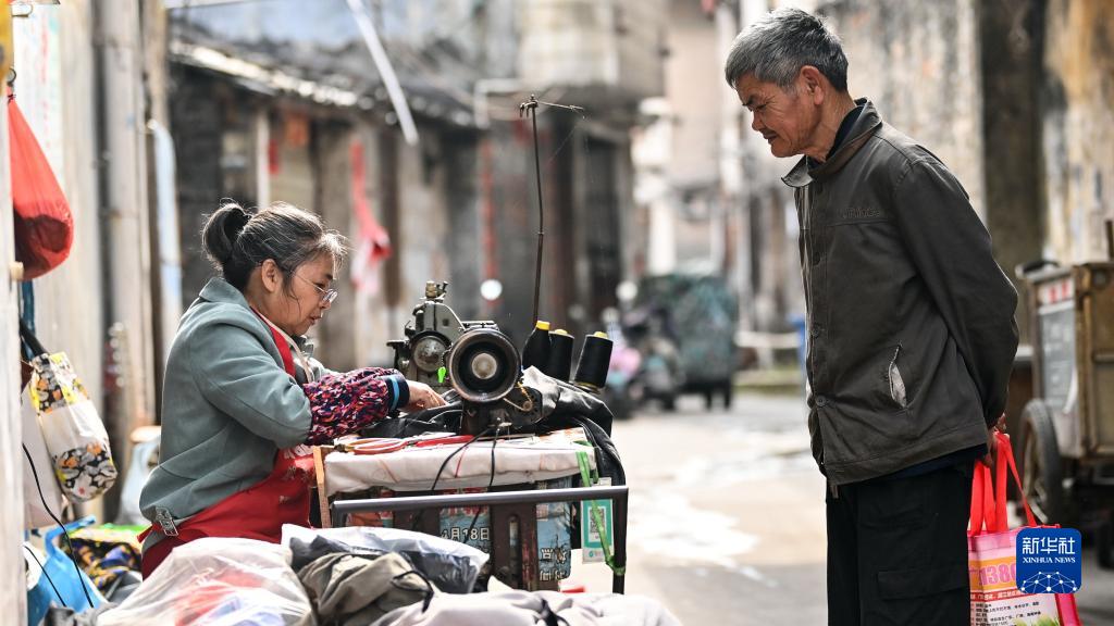 在欽州老街,一名裁縫在給一名市民縫補衣服(2月23日攝)。