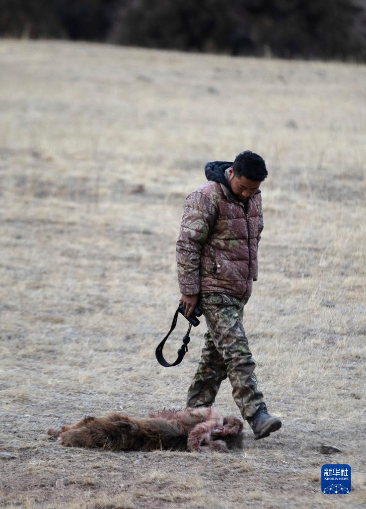 2月21日,更求曲朋在昂賽大峽谷里查看一只被獵殺不久的白唇鹿。
