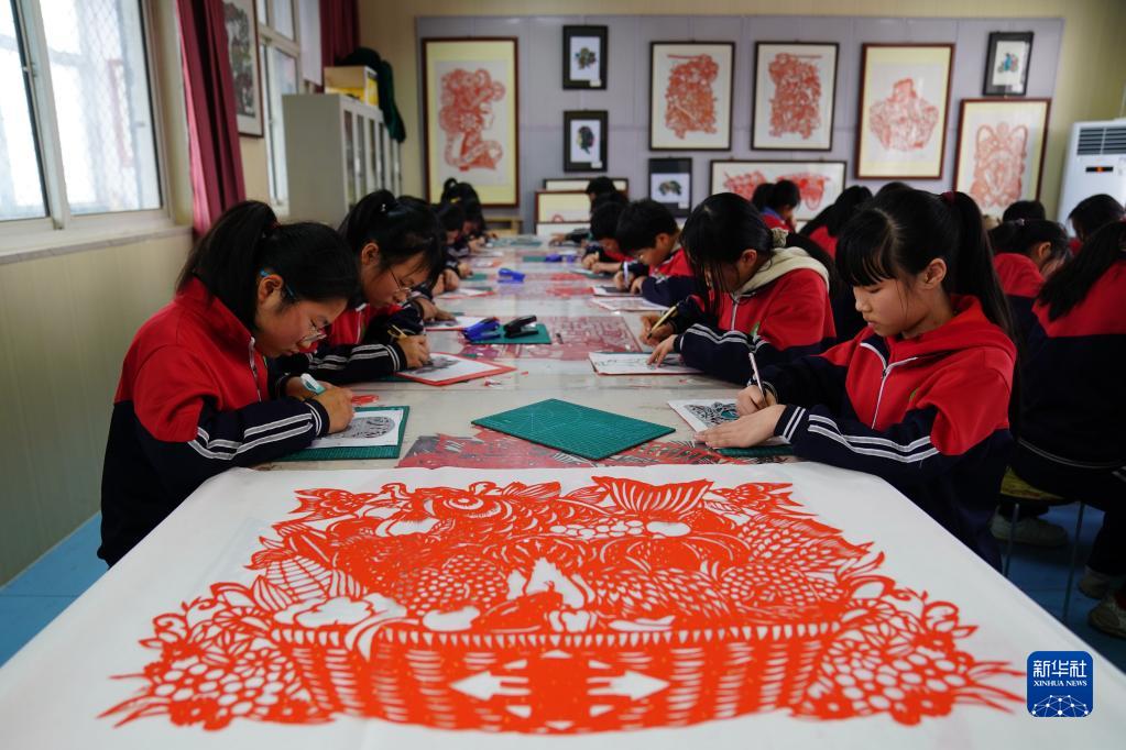 2月24日,河北邢臺經濟開發區景家屯小學學生在刻紙。