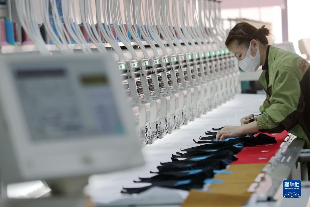 2月25日,工人在浙江省湖州市德清縣新安鎮一家紡織企業生產車間趕制刺繡訂單產品。