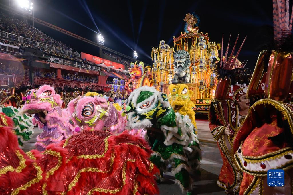2月21日凌晨,在巴西里約熱內盧桑巴大道,一輛以中國文化為主題的桑巴舞?;ㄜ噮⒓涌駳g節游行。