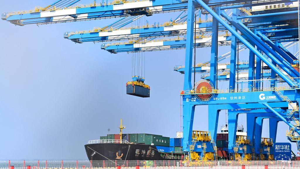 2月25日,在廣西欽州港自動化集裝箱碼頭,塔吊在運送集裝箱。