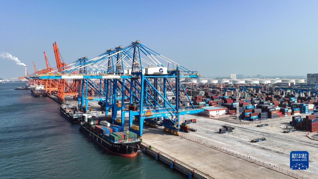 2月25日,海輪??繌V西欽州港自動化集裝箱碼頭卸貨(無人機照片)。