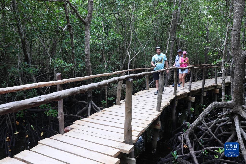 2月24日,游客在坦桑尼亞桑給巴爾島上的紅樹林里游覽。