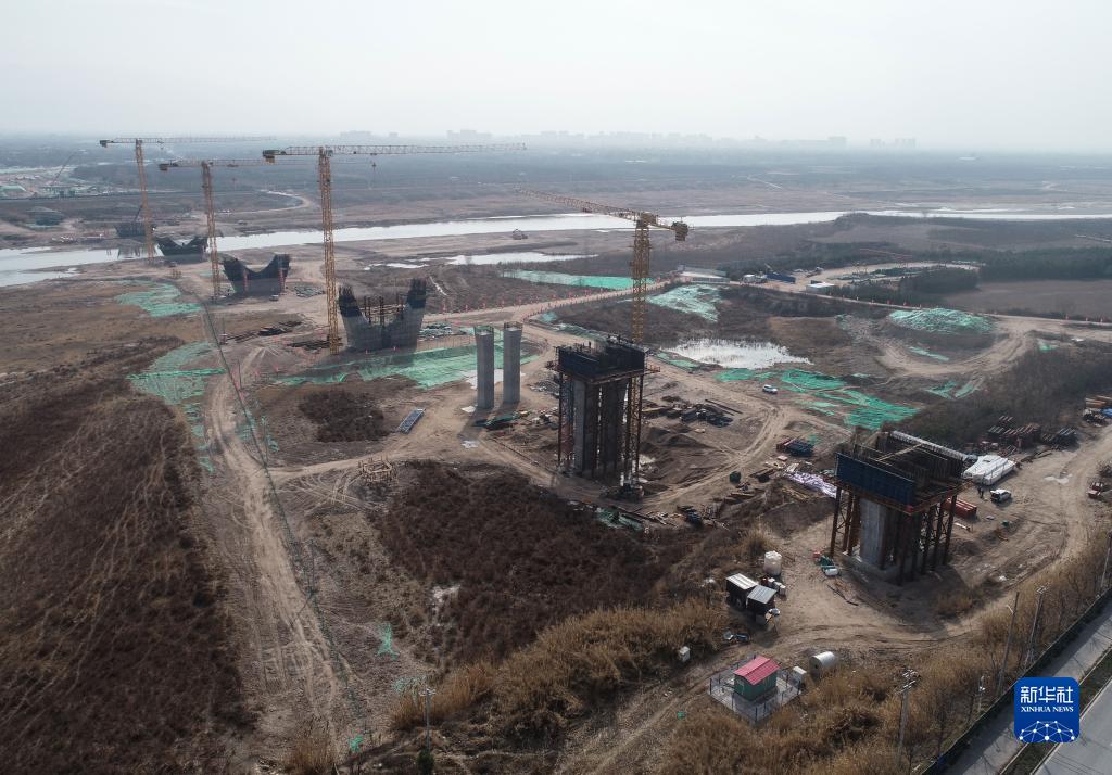 這是2月24日拍攝的位于西安市周至縣的陜西引漢濟渭工程渭河管橋施工現場(無人機照片)。