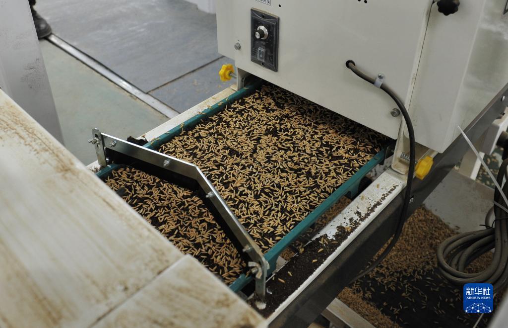 2月24日,在涇口鄉工廠化智能育秧中心,自動化裝備將種子秧土按照比例均勻鋪到秧盤上。