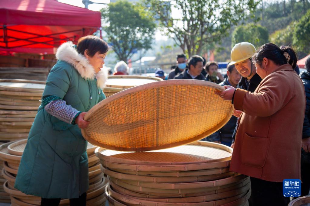 2月25日,人們在武夷山“柴頭會”上選購傳統竹制農具。
