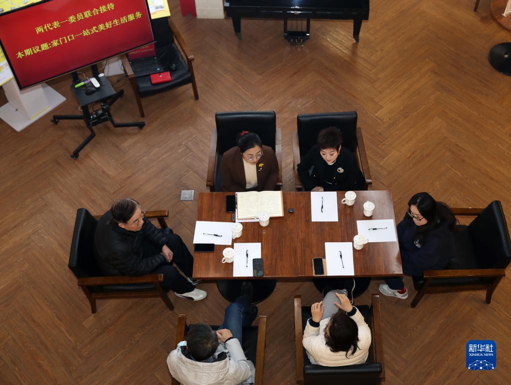2月17日,在上海虹橋街道古北市民中心,盛弘和居民區代表討論社區服務功能的相關議題。新華社記者 劉穎 攝
