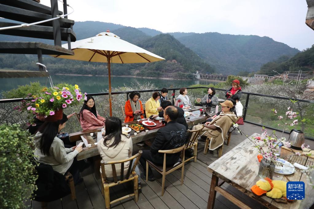 福州市永泰縣嵩口鎮大喜村游客在李花環繞的觀景臺上聊天(2月24日攝)。