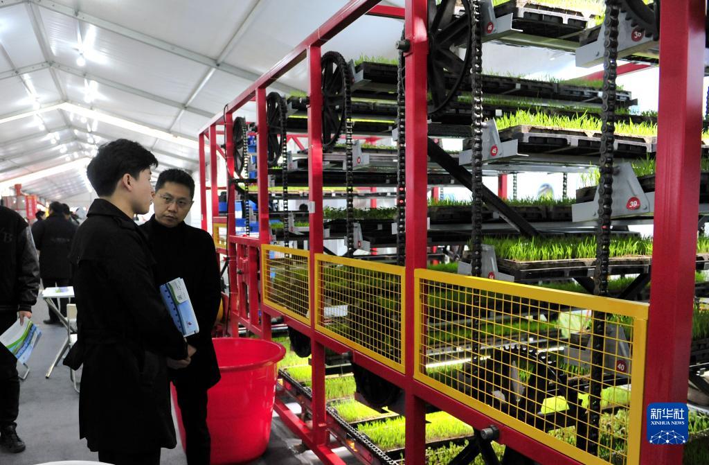 2月24日,觀展者在參觀循環運動式育苗設備。