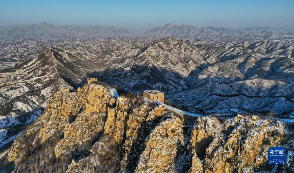 這是2月19日在晨曦中拍攝的雪后司馬臺長城(無人機照片)。