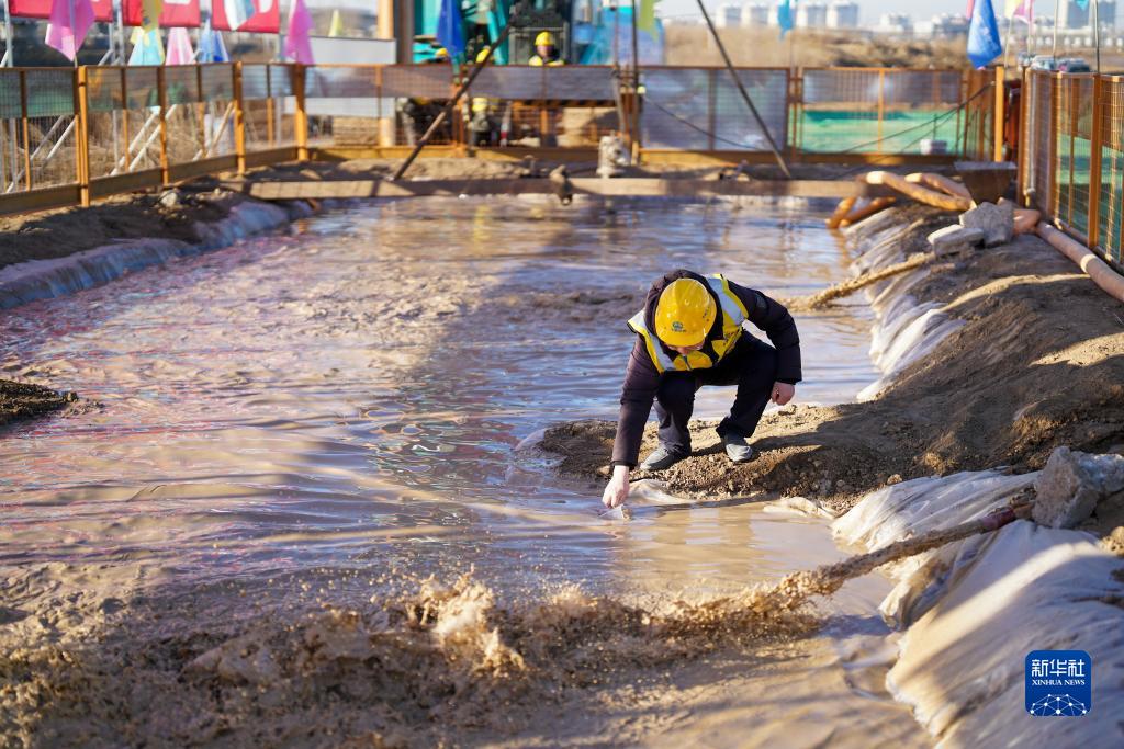 2月25日,中鐵電氣化局的施工人員在雄忻高鐵新蓋房特大橋建設現場對鉆孔泥漿進行取樣。