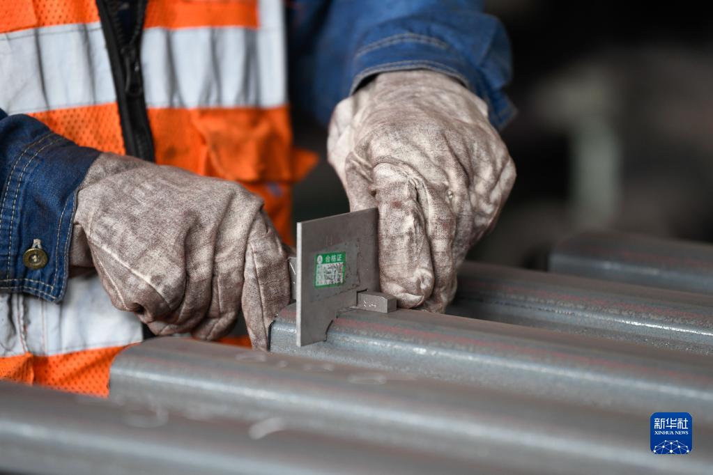 在攀鋼釩軌梁廠,工人對軋制成型的百米鋼軌進行表面檢測(2月24日攝)。