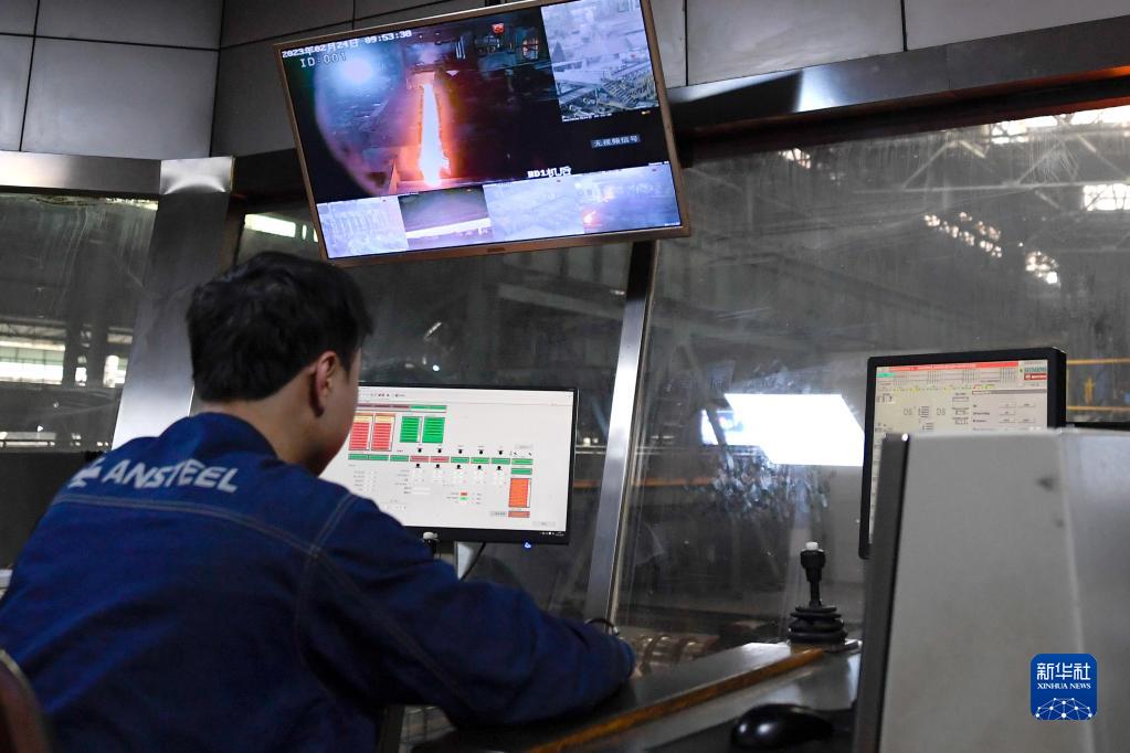 在攀鋼釩軌梁廠一軋機控制室內,軋鋼工關注軋機進出鋼狀態(2月24日攝)。