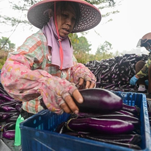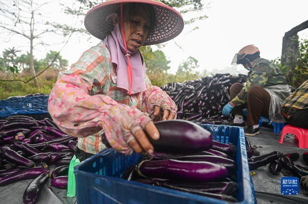 農戶在海南省屯昌縣坡心鎮一處農田邊分揀、打包采收的茄子(2月14日攝)。
