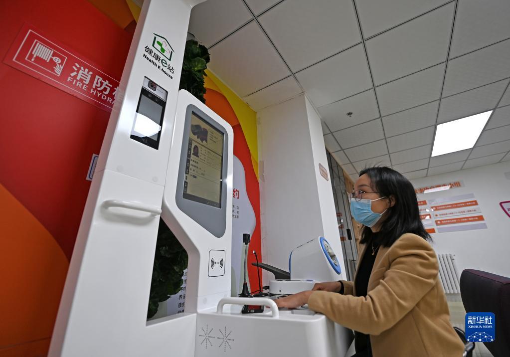 在中新天津生態城第三社區季景蘭庭小區,居民在體驗設在小區里的“健康e站”(2月24日攝)。