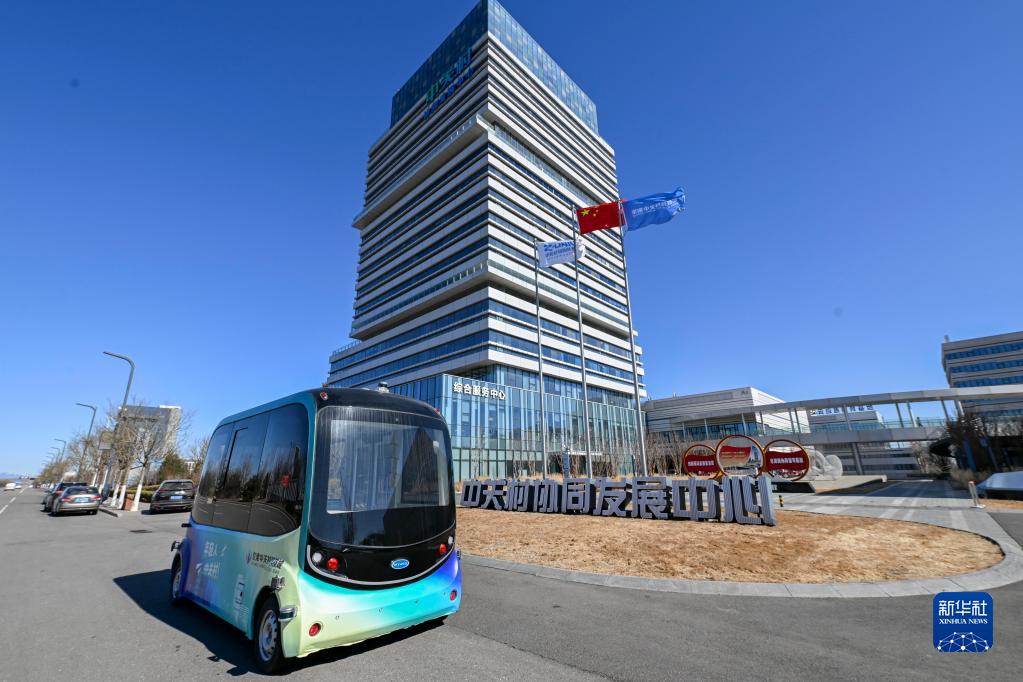 一輛無人駕駛汽車??吭诰┙蛑嘘P村科技城協同發展中心前(2月20日攝)。