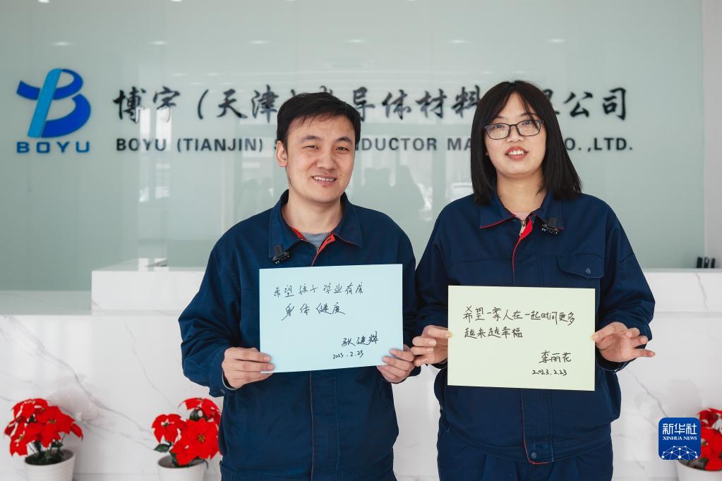 在博宇(天津)半導體材料有限公司,張建輝(左)和李麗花展示他們寫下的心愿(2月23日攝)?!?5后”夫妻張建輝和李麗花曾在北京打拼多年,二人目前同在博宇(天津)半導體材料有限公司從事生產工作。2020年,他們落戶天津寶坻京津中關村科技城,并在配套的中關村創新人才社區居住,孩子也從山東老家接來身邊上學,一家三口實現了同城生活。張建輝希望孩子學業有成、身體健康,李麗花希望一家人在一起的時間更多、越來越幸福。