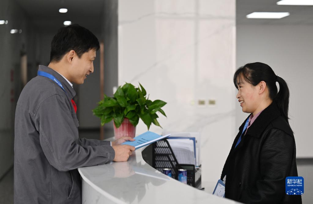 在萊伯泰科(天津)科技有限公司,劉學(左)和于麗新在交流(2月23日攝)。今年37歲的劉學曾在北京工作多年。2019年,他和妻子于麗新一起被派到天津寶坻京津中關村科技城,參與分公司的設立?,F在他們一家人已經在天津落戶。于麗新希望家人健康平安、孩子學業有成。劉學說,妻子的愿望就是他的愿望。